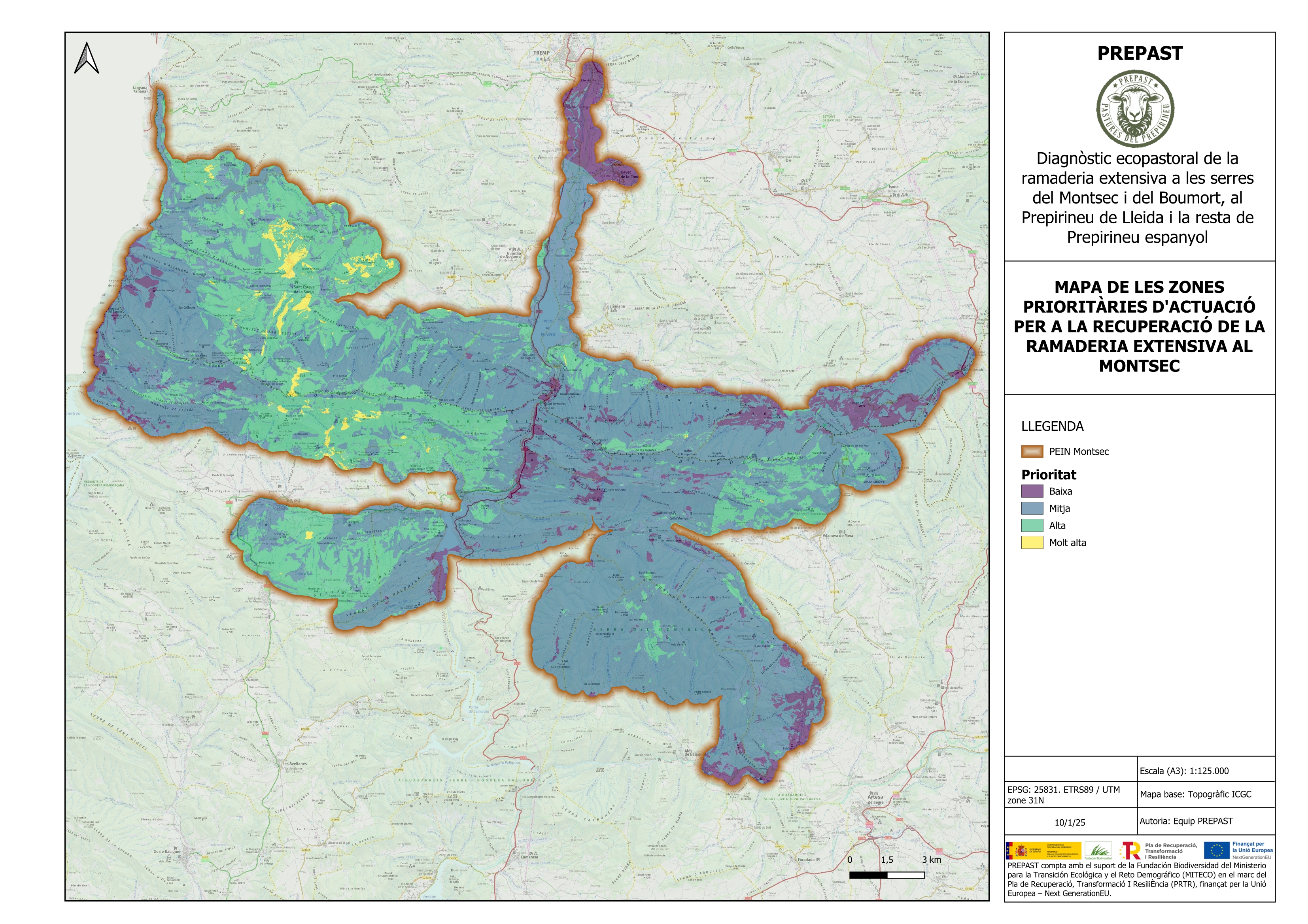 El resultat és un mapa que classifica el territori en quatre nivells de prioritat, que serveix com a eina per seleccionar les àrees d’intervenció demostrativa del projecte PREPAST. Aquesta informació contribueix a impulsar una gestió sostenible que afavoreix el manteniment del mosaic agroforestal, la resiliència del paisatge i la conservació dels valors naturals i culturals del Montsec.